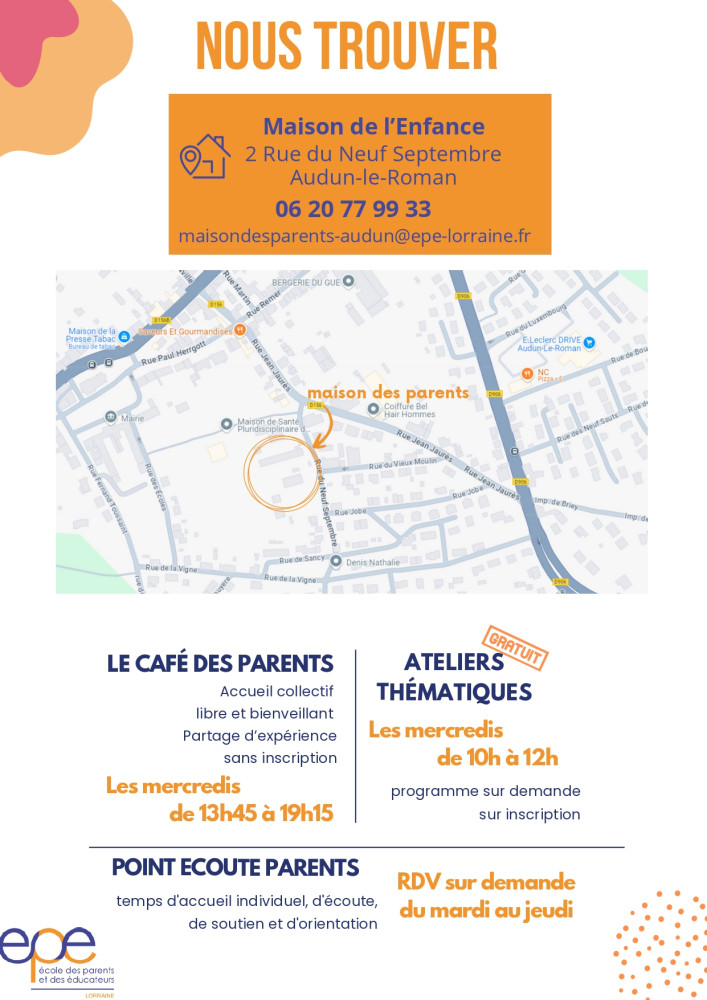 L'Ecole des Parents et des Educateurs, acteur historique et reconnu sur les questions liées à la parentalité, a ouvert sa première Maison de la Parentalité  à Audun-le-Roman depuis novembre 2023.