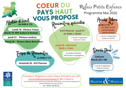 Consulter le programme d'activités concocté par le Relais Petite Enfance pour le mois de mai :
